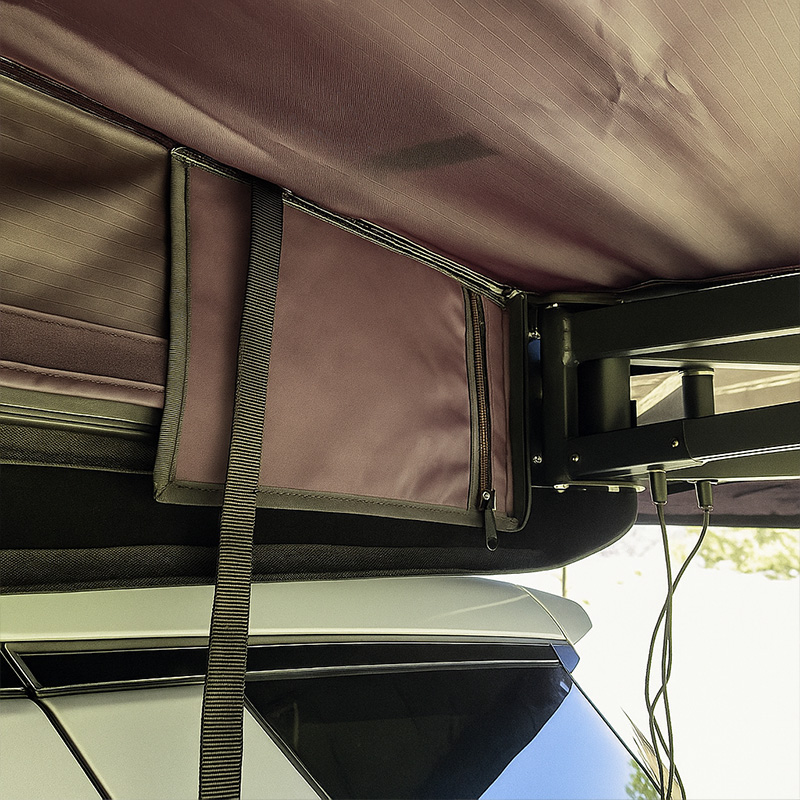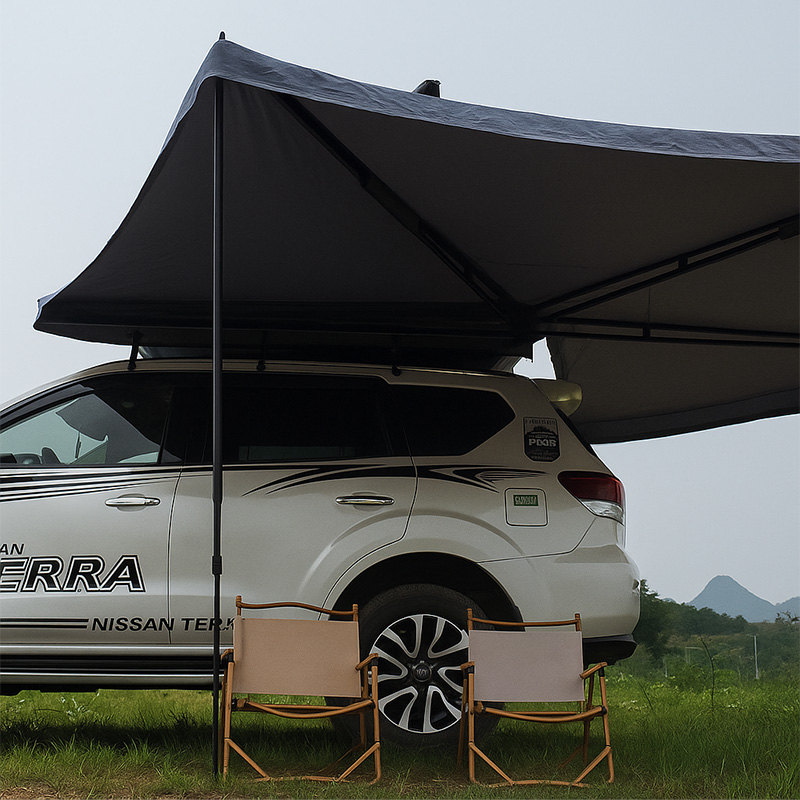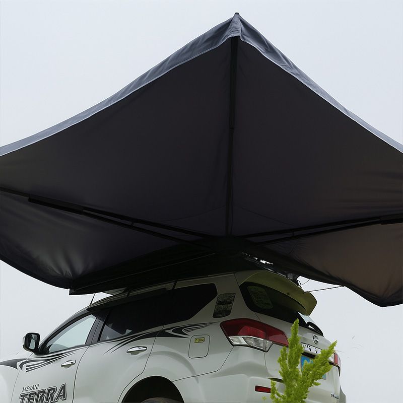 The 270-degree awning can extend from the side of the vehicle to the rear, providing approximately 100 sq .It’s made of 420D Poly Cotton Rip-Stop Cover, Boxed Aluminum Rafters,Zippers To Secure Enclosed Shelter, Heavy Duty Oversized Stakes.Setting up the awning in 5 minutes.The package contains universal accessories for installation.